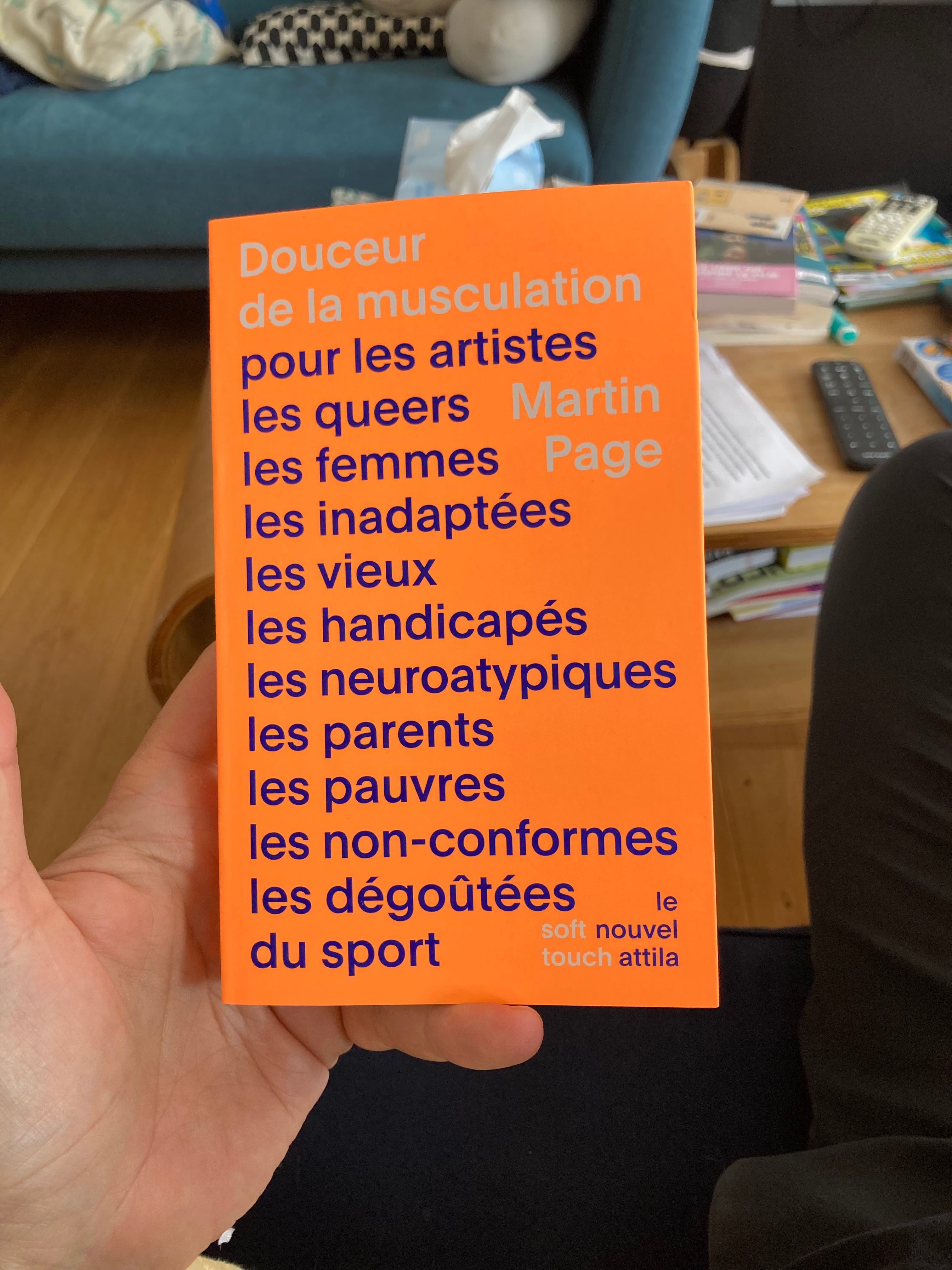 Ce livre s’adresse aux personnes qui, comme moi, ont longtemps été dégoutées du sport, mises de côté. C’est un essai, mais aussi un texte autobiographique et pratique (je donne des conseils, j’y parle nutrition). On pourrait dire qu’il s’inscrit dans la cadre de l’autothérie (Lauren Fournier). Il est en lien avec ma neuroatypie et ma queerness, avec ma précarité financière et sociale, avec mon statut de papa aussi. Bien évidemment c’est un texte politique. Il est hors de question que nous laissions les muscles (et leurs bénéfices pour notre santé, notre autonomie) aux mascus et aux fachos. Ce savoir est un bien commun. Nous devons travailler à le récupérer.